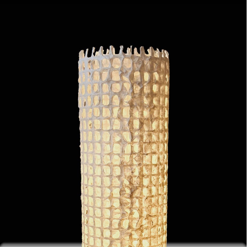 日中は彫刻のように佇み、夜は格子の一つひとつが呼吸するように淡く光る――